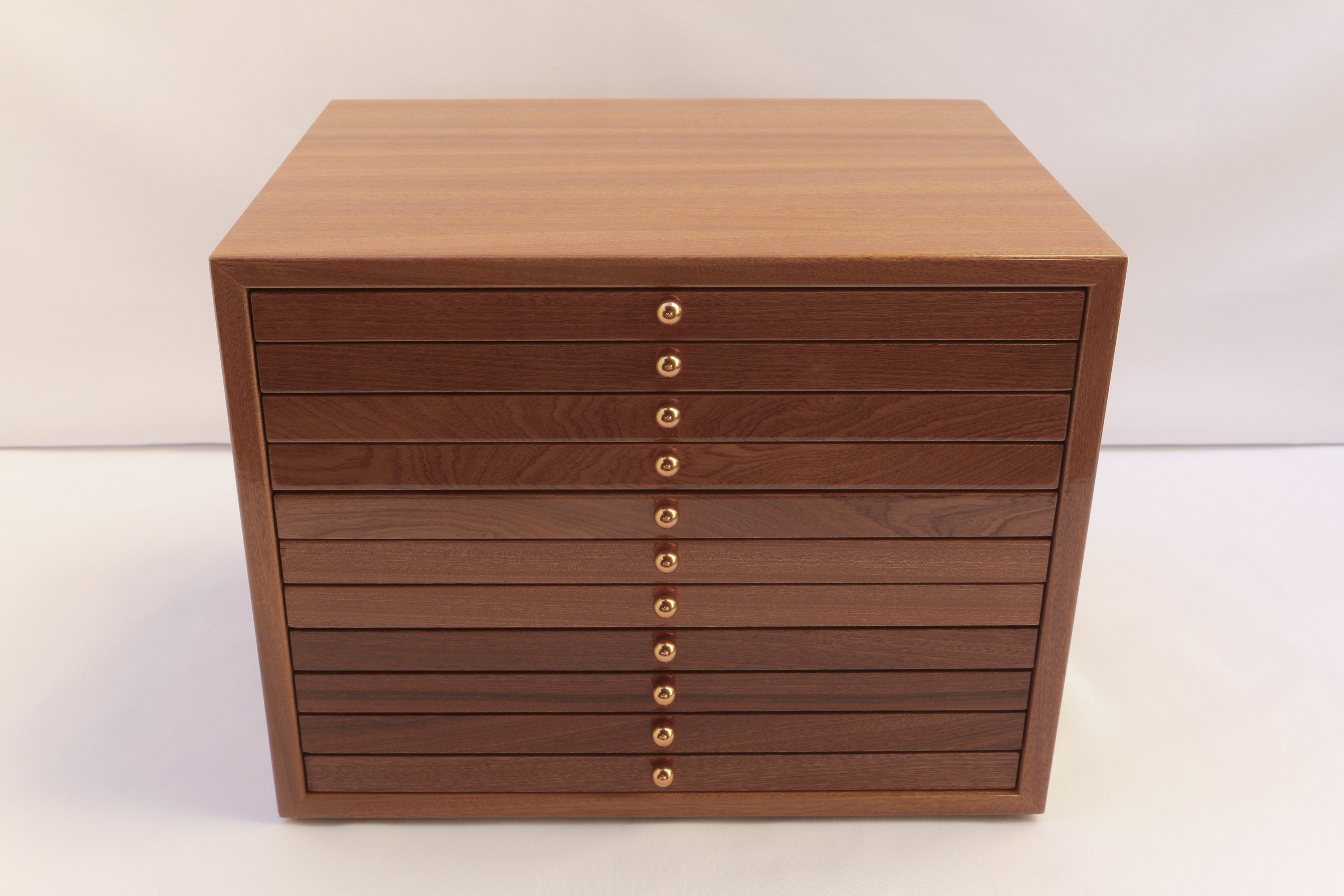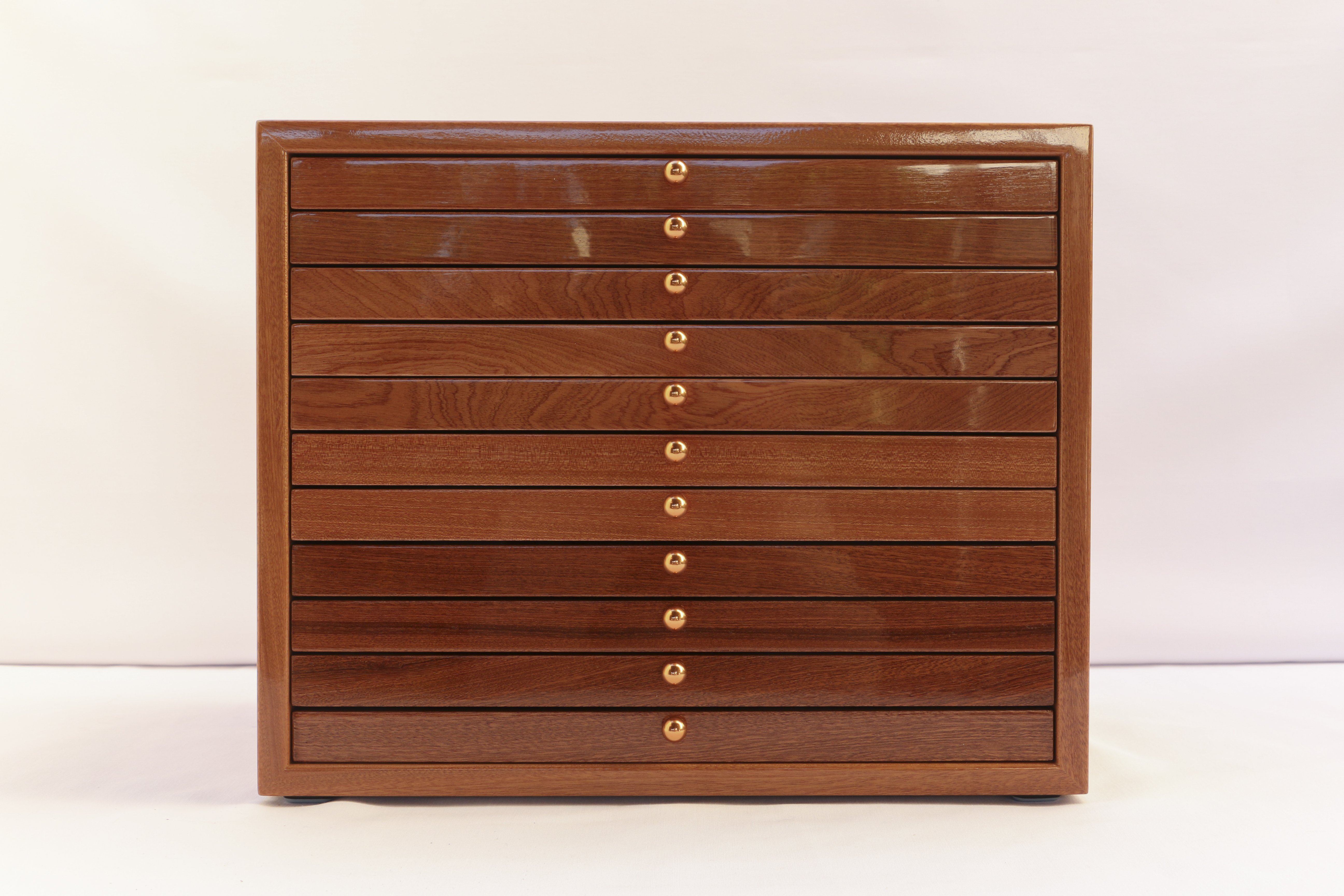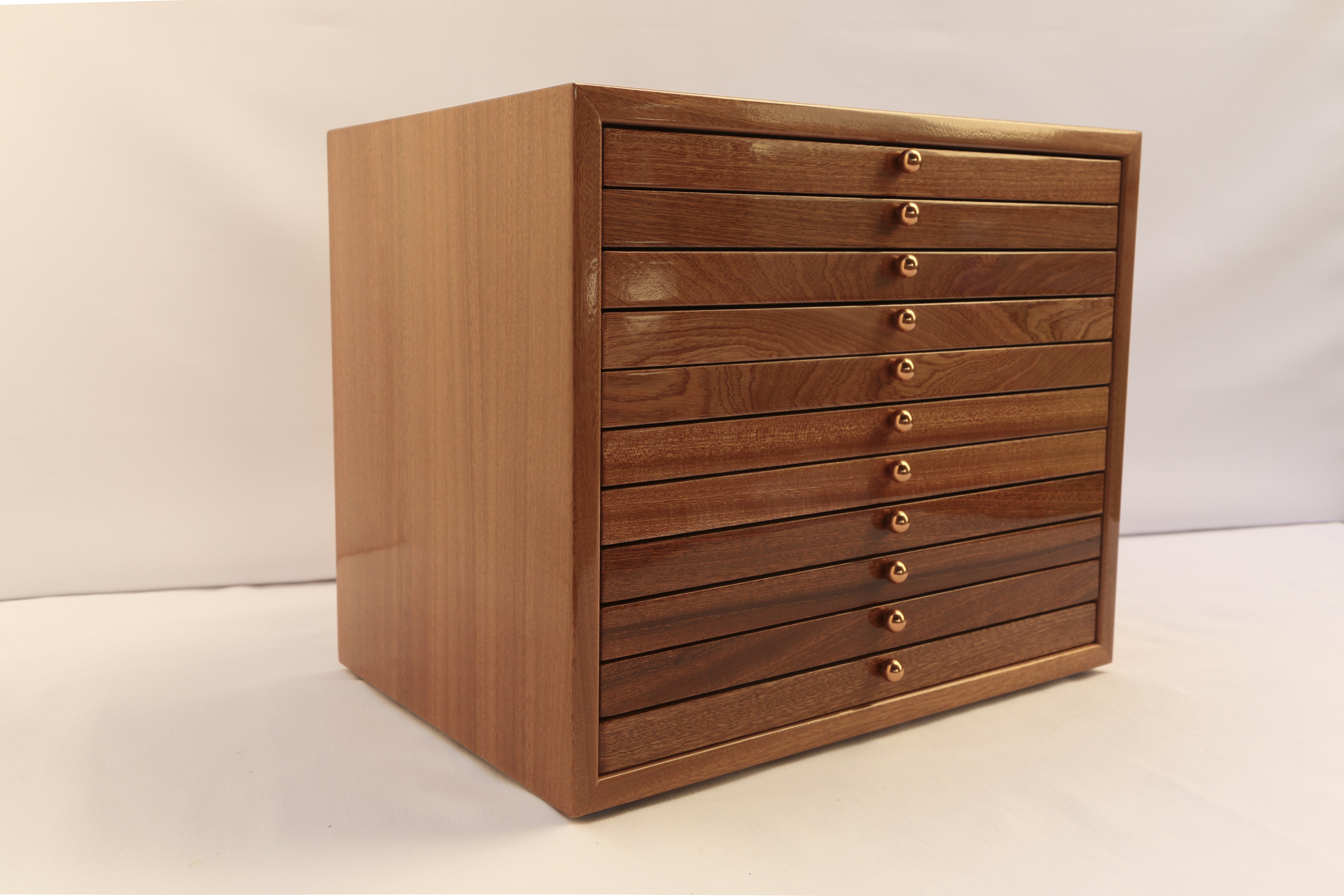 Ogni cassetto scorre su binari in legno, può contenere un vassoio in panno per conservare al meglio le monete della vostra collezione.