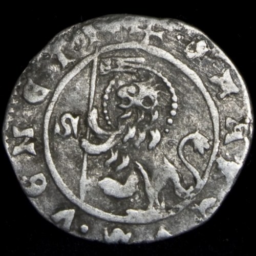 Leone, con nimbo di perline, rampante a sx con vessillo; davanti nel campo S ruotata di 180°.