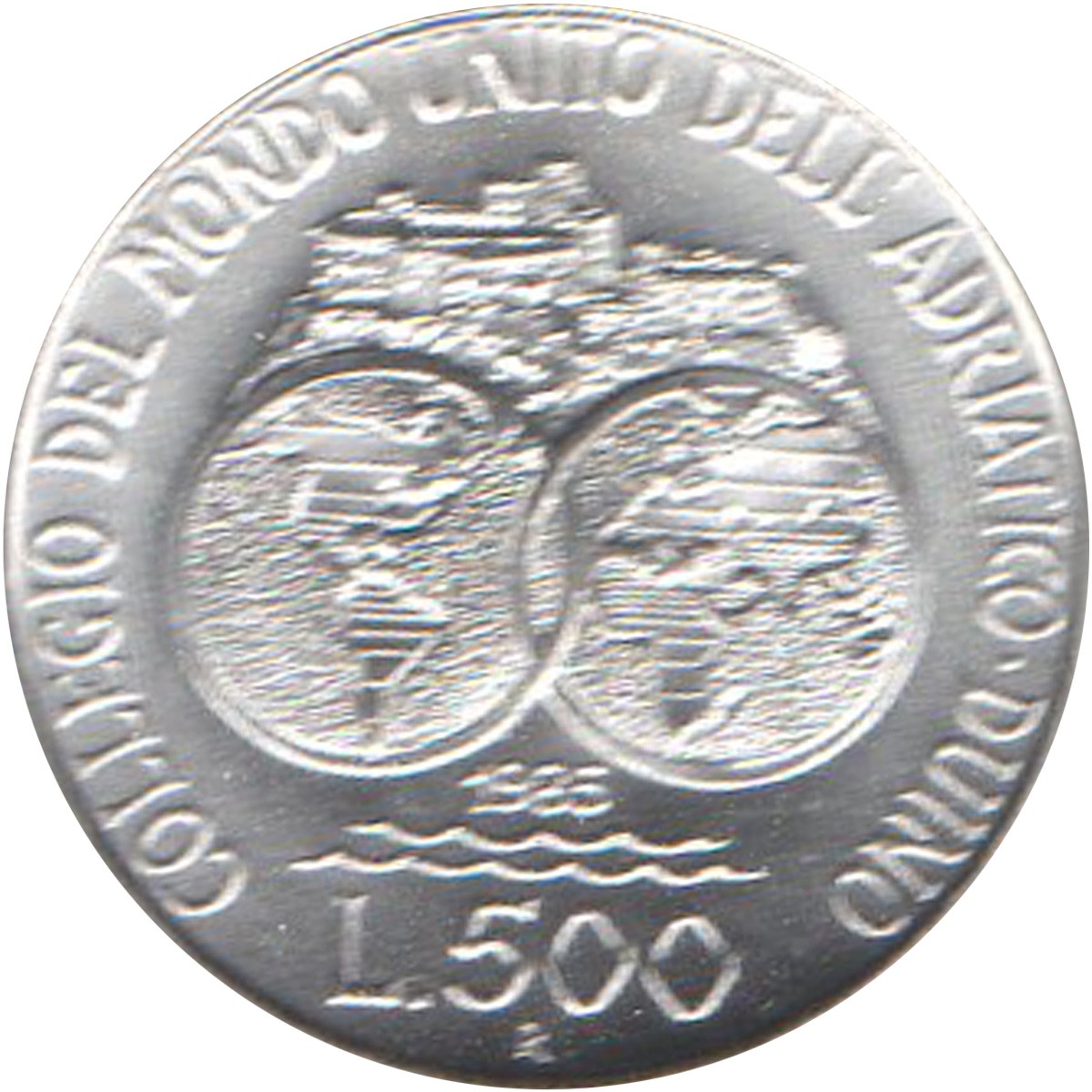 in giro la scritta "collegio del mondo unito dell'adriatico Duino" ed in basso "1985" con due onde stilizzate, "L.500" e il marchio di zecca "R".
