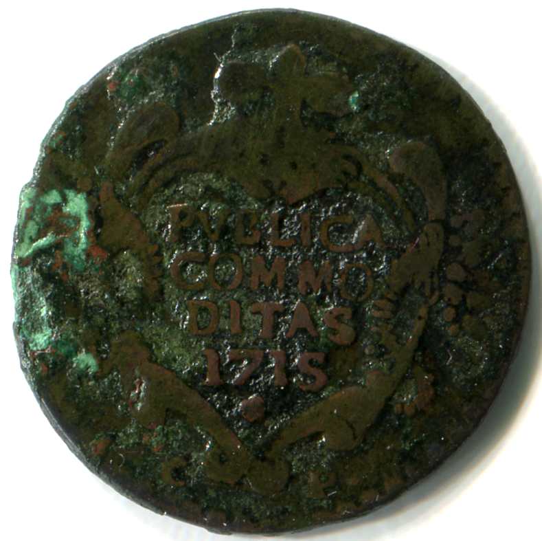 PUBLICA COMMO DITAS 1715 sigla C P- Scritta dentro cartella con cornucopie ai lati
