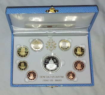 Serie Divisionale FS (proof) del Vaticano, millesimo 2012. Con moneta d'argento da 20€ "Decennale dell'Euro Vaticano", diametro 34 mm, 22 gr, Ag 925.Tiratura 13.000 esemplari.