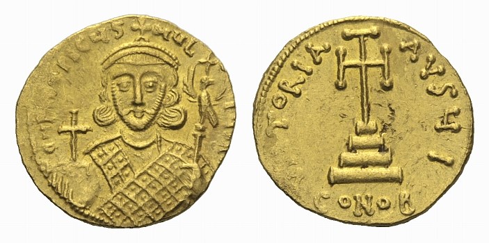 Philippicus Bardanes, 711–713 Solidus 711-713, AV 20.5mm, 4.43 g. DN FILEPICYS – MYL – TYS AN Bust facing, with close beard, wearing loros and crown with cross, holding globus cruciger in r. hand and eagle-tipped sceptre with cross above in l. Rev. VICTORIA AVGU I Cross potent on four steps; in exergue, CONOB. DO 1j. MIB 1. Sear 1447.