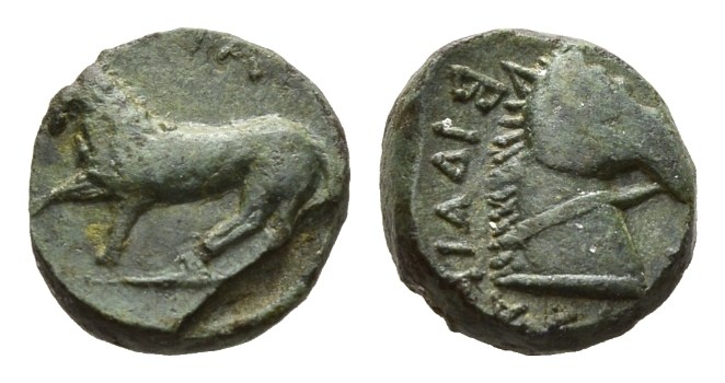 Apulia, Teate Bronze circa 325-275, Æ 16.5mm, 6.64 g.TIATI (retrograde) Lion walking left. Rev. BIΔAIT AKAΛI (retrograde) Head and neck of bridled horse right. Garrucci Pl. XCII, 10 (misdescribed) H.N. Italy -.