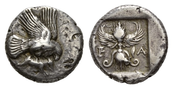 Elis, Olympia Stater circa 440-430, AR 23.5mm, 12.31 g. Eagle flying right, holding rabbit in its talons. Rev. F – A Winged thunderbolt. Seltman 95a (this coin). Weber 4022 (this coin). Jameson 2097 (this coin). BCD Olympia 40 (this coin).