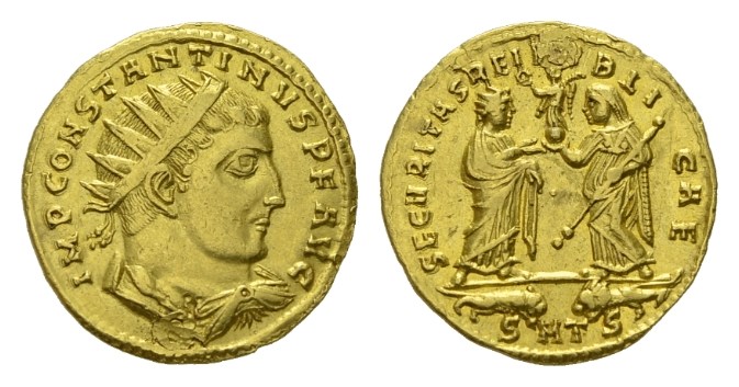 Constantine I, 307-337 Medallion of 1 1/2 solidi, Thessalonica circa 315, AV 22.5mm, 6.62 g. IMP CONSTANTINVS P F AVG Radiate, draped and cuirassed bust right. Rev. SECVRITAS REIPVBLICAE. Securitas, standing facing, holding scepter in l. hand, presenting Victory-on-globe to Constantine, togate and radiate, who is crowned by Victory; pellet between. In exergue, SMTS beneath confronted lioness(?), at l., and lion, at r., two pellets between. C –. RIC -. Kent-Hirmer 630 (this coin). Kent-Overbeck-Stilow-Hirmer 635 (this coin). Depeyrot p. 153 (this coin cited).