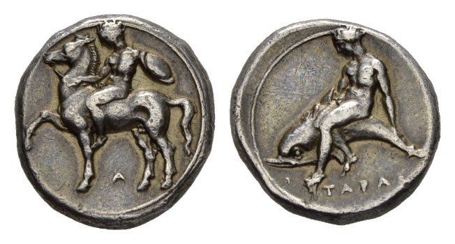 Calabria, Tarentum Nomos circa 390 - 385, AR 20mm., 7.87g. Horseman left, holding reins with r. hand and shield with l.; below, A. Rev. Dolphin rider left, with l. hand resting on dolphin’s back; below, ΤΑΡΑΣ. . Historia Numorum Italy 869. Vlasto 379 (this obverse die). Fischer-Bossert 438.