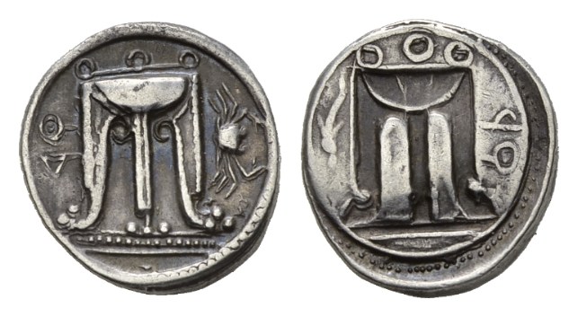 Bruttium, Croton Nomos circa 480-450, AR 20mm., 8.04g. QP retrograde Tripod with legs ending in lion’s feet; in field r., crab. Rev. QP retrograde The same type incuse; in field l., in relief, dolphin swimming downwards. SNG Ashmolean 1470. SNG ANS 282 (these dies). Historia Numorum Italy 2100.