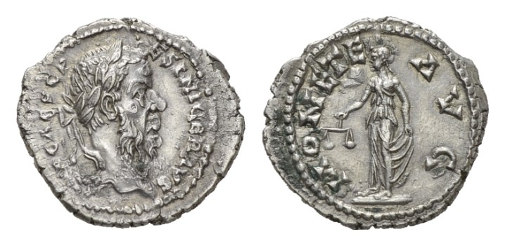 Pescennius Niger, 193-194 Denarius Antioch circa 193-194, AR 20mm., 3.50g. IMP CAES C PESC NIGER AVG Laureate head right. Rev. MONETA AVG Moneta standing left holding scales and cornucopiae. RIC. 64 var. C 56 var. BMC 310 note.