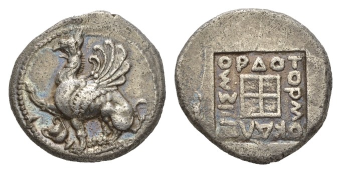 Thrace, Abdera Tetradrachm 473-448, AR 26.5mm., 14.69g. Griffin seated left, r. forepaw raised; in front kantharos. Rev. ΕΠIΣMOPΔOTOPMOKAΛ within incuse square. SNG Spencer-Churchill 100 (this obverse die). SNG Lockett 1124 (this reverse die). May 137.