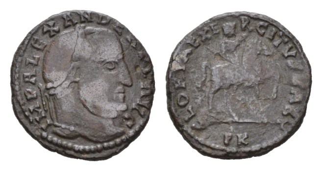 Alexander, 308-310 Follis Carthago circa 308-310, Æ 21mm., 5.10g. IMP ALEXANDER P F AVG Laureate head right Rev. GLORIA EX-ERCITVS KART Alexander radiate, raiding right and rising right hand; in exergue P K. RIC 66.