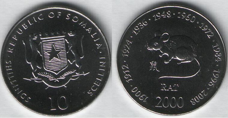 ROVESCIO Moneta della serie "Oroscopo Cinese". Al centro il TOPO. Sotto la scritta in Inglese RAT e di lato in Cinese. Nella parte bassa l'anno "2000". Attorno gli anni che rappresentano il Topo nell'Oroscopo Cinese.