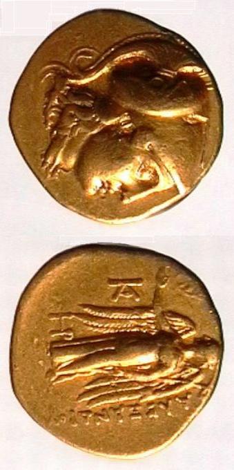 R/: Vittoria stante a sinistra - ALEΞAΝDΡΟΥ a destra - nel campo 2 monogrammi: KA - HP