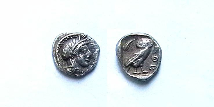 R/: Civetta a destra. ΑΘΕ a destra e foglia di ulivo a sinistra. Tutto in quadrato incuso
