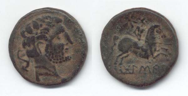 Reverso: Pegaso a derecha; debajo, sobre línea, inscripción ibérica BoLSKaN (losan)