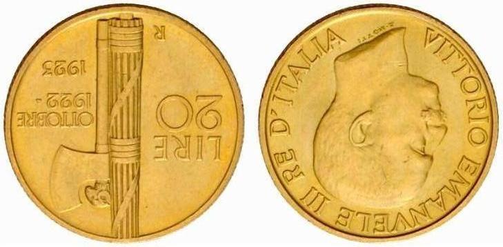 R/: Fascio littorio con scure a dex. Alla six,in due righe, LIRE 20 con sotto, il segno di zecca; alla destra del fascio,in due righe, OTTOBRE 1922 e nel basso, 1923.