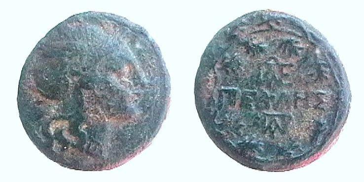 D/: Testa elmata di Mercurio (?) a destra