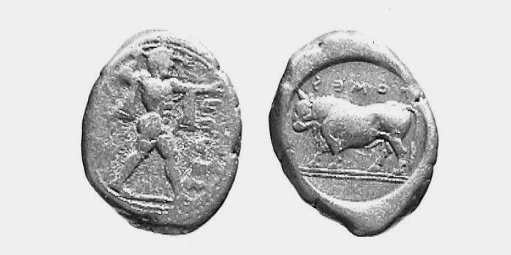 R/: Toro a sinistra. Sopra ΠΟΜΕS retrogrado. Tutto in cerchio leggermente incuso