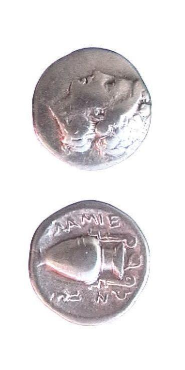 R/: Anfora. Ai lati ΛΑΜΙΕ ΩΝ e un prochous (brocca)