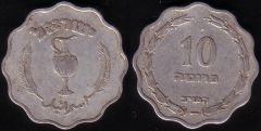 R: Il numero 500 del valore è al centro con la scritta “Prutah” in ebraico. In basso la data “5709” in lettere ebraiche, corrispondente al 1949. Il tutto è racchiuso fra due rami di ulivo a semicerchio.