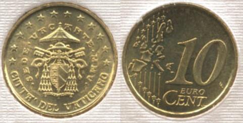 Nel lato non comune a tutte le monete europee, la moneta da 10 centesimi raffigura lo stemma del Cardinale Camerlengo e quello della Camera Apostolica (chiavi decussate sormontate da un padiglione), le scritte "CITTA' DEL VATICANO", "SEDE VACANTE MMV" e dodici stelle.