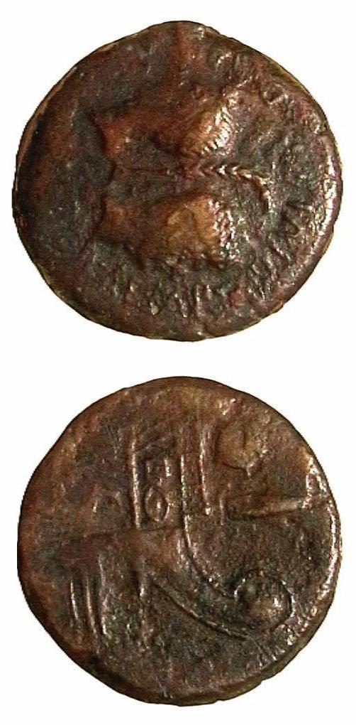 D/: DIVI JULI IMP CAESAR DIVI F. Testa laureata di Cesare a sinistra e nuda di Ottavio a destra. Fra loro una palma
