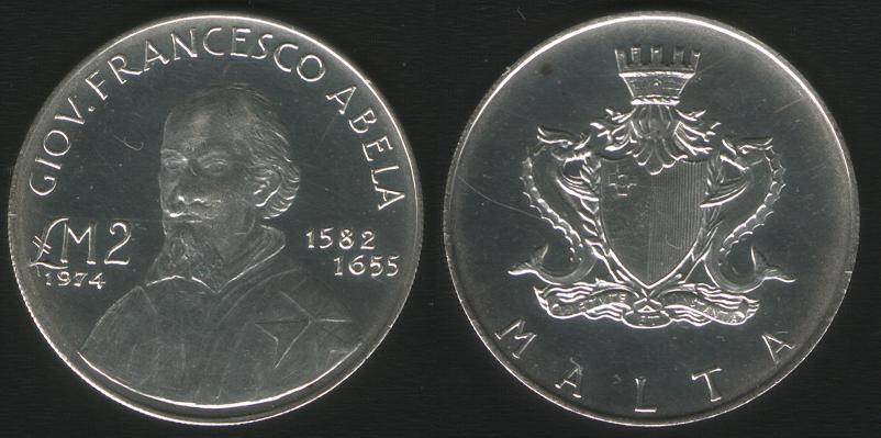 FRANCESCO ABELA, a sinistra £M2 e sotto più piccolo l'anno 1974. A destra le date di nascita e morte 1582 e sotto leggermente spostato a destra 1655.