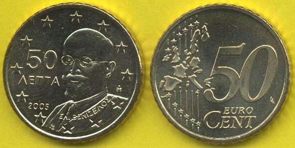 Sulla moneta è presente un ritratto di Eleftherios Venizelos (1864-1936), una delle più importanti figure politiche della Grecia. Pioniere delle riforme sociali e illustre diplomatico, ricoprì un importante ruolo nella modernizzazione ellenica e nella liberazione della Grecia del Nord e delle isole dell'Egeo. A completare la raffigurazione appaiono le docici stelle, la data di conio, il simbolo della zecca e la scritta 50 lepta.