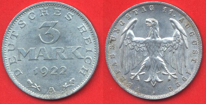 Fronte: numero "3" indicante il valore, che sovrasta la scritta "Mark" e l'anno di conio (1922 in questo caso). In basso il simbolo della zecca, attorniato da due ghiande. A contorno la scritta "Deutsches Reich".