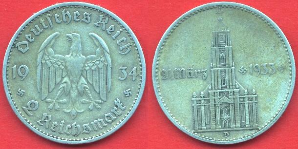 Fronte: aquila tedesca volta a sinistra, ai lati, separata dall'animale, la data 1934. Sotto la data appaiono due croci uncinate. Nel contorno la scritta "Deutsches Reich" e "2 Reichsmark".