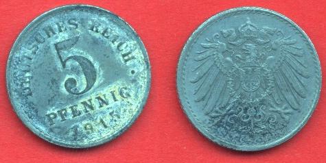 Fronte: cifra indicante il valore "5". Sotto il numero cinque la scritta "Pfennig", nel cotorno invece la dicitura "Deutsches Reich" e, in basso, l'anno di conio, in questo caso 1915.