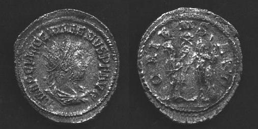 R/: ORIENS AVG - Il Sole radiato in piedi a destra porge una corona a Gallieno in abito militare che tiene un'asta