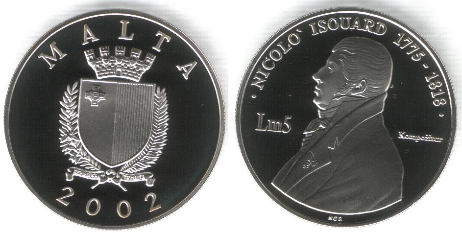 ROVESCIO : Il busto del compositore maltese Nicolò Isouard rivolto a sinistra. Attorno in alto ". NICOLO' ISOUARD 1775 - 1818 .". A sinistra del busto il valore della moneta "Lm5" e a destra molto piccolo si legge "Kompzitur". Sotto il busto la sigla "NGB" del disegnatore, Noel Galea Bason.