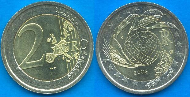 La moneta rappresenta il globo terrestre, circondato da una pannocchia, una piantina di riso e da una spiga di grano. Al centro del globo spicca la scritta "World Food Programme". A completare l'incisione l'anno di conio (2004), le dodici stelle, simbolo dell'Europa Unita, la firma dell'incisore, il simbolo della Repubblica Italiana e la "R" indicante la zecca di Roma. La moneta, dedicata al Programma Alimentare Mondiale della FAO è la prima commemorativa italiana ed è stata emessa il 13 dicembre 2004 in 16.000.000 di pezzi. Esiste un folder non ufficiale emesso dalla FAO.