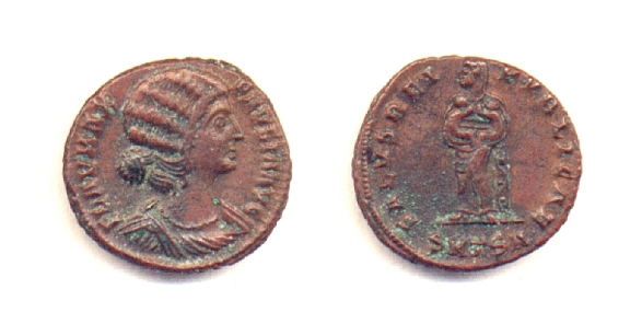 R/: SALVS REI PUBLICAE - Fausta in piedi di fronte guarda a sinistra e tiene in grembo i figli Costantino e Costante. In esergo SMTSA