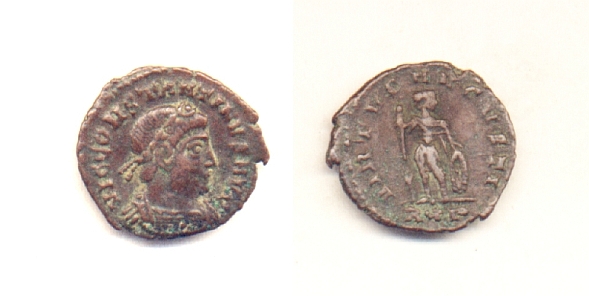 R/: VIRTUS AVGVSTI - Costantino in piedi di fronte in abito militare guarda a destra, tiene un'asta e si appoggia a uno scudo. In esergo RXP