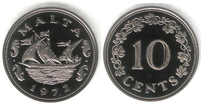 ROVESCIO : Al centro una imbarcazione a vela del Grande Maestro. Ai lati 4 pesci, due per lato con al centro un punto. In alto "MALTA" e sotto l'anno.