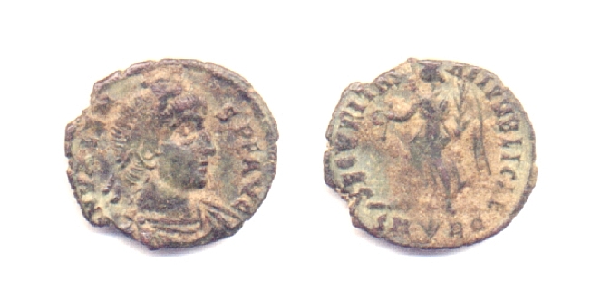 D/: D N VALENS P F AVG - Busto diademato e drappeggiato a destra