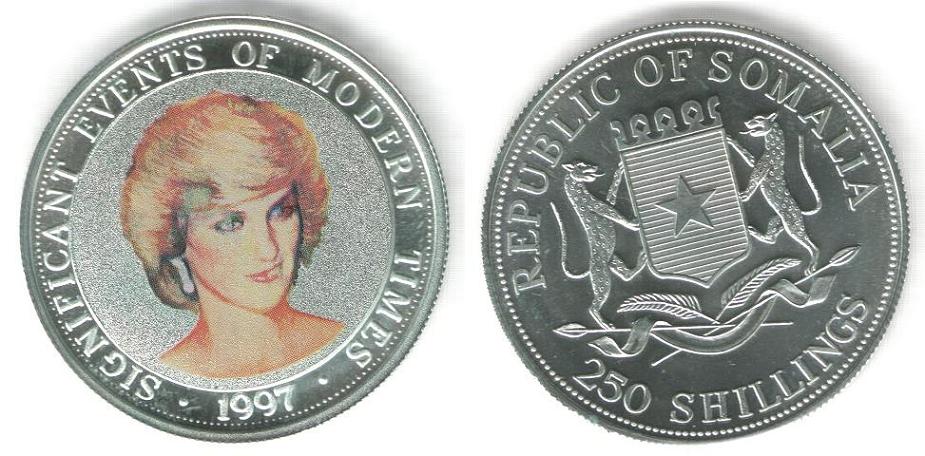 DRITTO : Lo stemma della Somalia, in alto attorno "REPUBLIC OF SOMALIA" e sotto "250 SHILLINGS".