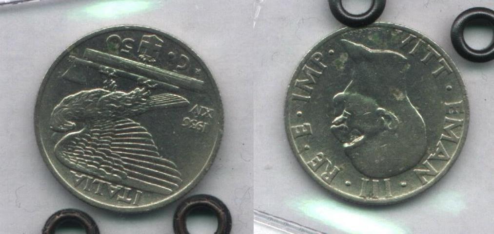 Rovescio: Aquila su fascio e scure, a sx millesimo di conio e anno era fascista, sopra ITALIA; in esergo valore, stemma sabaudo e segno di zecca R (Roma)