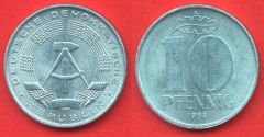 Fronte: La moneta raffigura il simbolo della Germania Orientale, il martello ed il compasso iscritti in un cerchio di spighe di grano cui è arrotolato un drappo. Intorno appare la scritta "Deutsche Demokratische Republik" (Repubblica Democratica Tedesca).