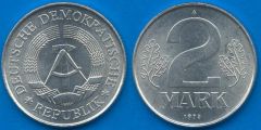 Retro: In grandi la cifra "2" indicante il valore e circondato ai lati da due foglie di quercia. In basso la scritta "Mark" e l'anno di conio (in questo caso 1975). In alto la "A" simbolo della zecca della Germania Orientale.
