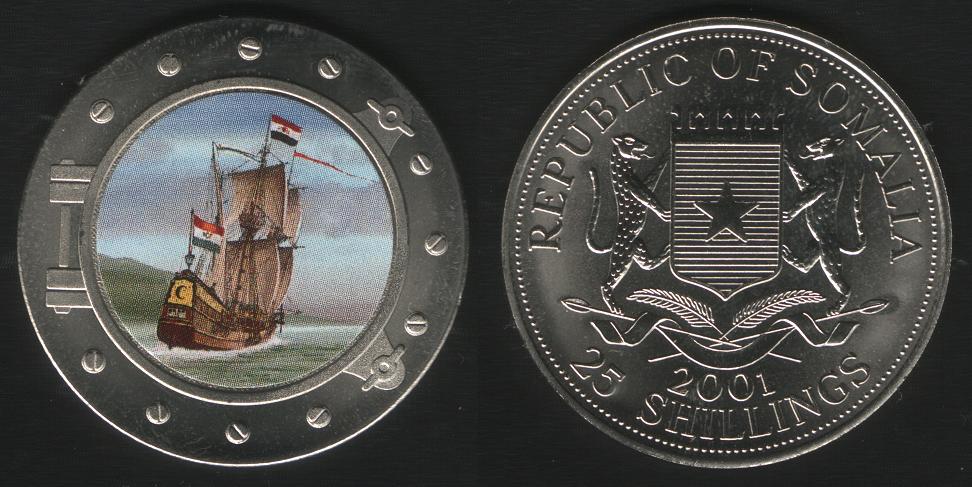 DRITTO : Al centro della moneta lo stemma della Somalia. Sopra attorno "REPUBLIC OF SOMALIA", sotto lo stemma l'anno "2001" e ancora più sotto in caratteri leggermente più grandi dell'anno il valore "25 SHILLINGS".