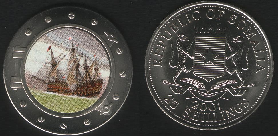 DRITTO : Al centro della moneta lo stemma della Somalia. Sopra attorno "REPUBLIC OF SOMALIA", sotto lo stemma l'anno "2001" e ancora più sotto in caratteri leggermente più grandi dell'anno il valore "25 SHILLINGS".