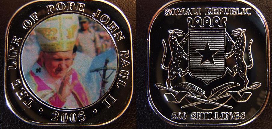 ROVESCIO : Al centro in un cerchio a colori la foto di Papa Giovanni Paolo II mentre saluta. Tutto attorno la scritta in inglese "THE LILFE OF POPE JOHN PAUL II" e sotto tra due punti l'anno 2005.