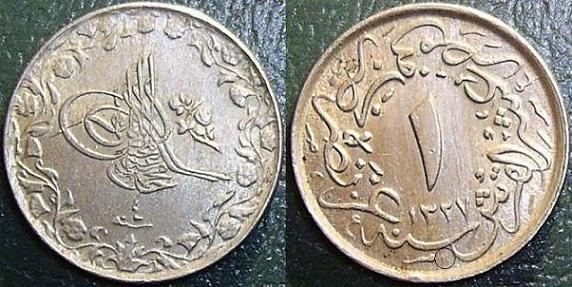 Dritto: Toughra di Muhammad V, che regnò (anche se solo nominalmente) in Egitto tra il 1909 e il 1914. In basso il numero arabo “4” a indicare il quarto anno di regno. Bordo liscio decorato da fiori.