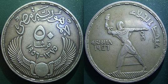 Rovescio: Antico egiziano, simile ai personaggi raffigurati nelle piramidi, che tiene una fiaccola nella destra e che ha ai polsi una catena spezzata: è una figura che richiama alla libertà, dal momento che la moneta venne coniata in occasione della nazionalizzazione del Canale di Suez e della cacciata degli Inglesi. A sinistra, la data “18 giugno” e l’anno “1956”, entrambi in arabo. A destra, un’iscrizione in lingua araba. Lungo il bordo, si alternano linee e punti.