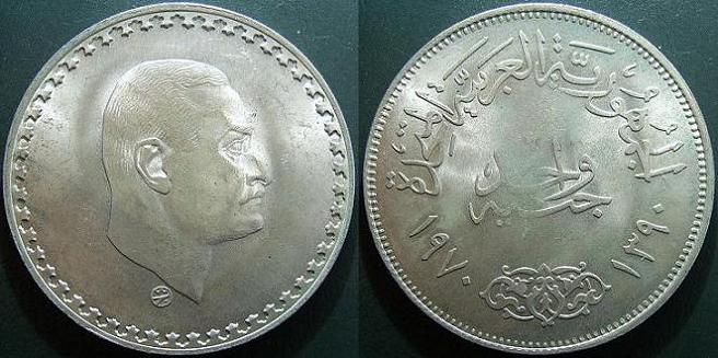 Rovescio: In alto, nel giro, appare l’iscrizione che significa “Repubblica Araba Unita”, la realtà politica fondata nel 1958 dal presidente egiziano Nasser e che comprendeva Egitto, Siria e Yemen. Nel giro basso vi è invece un’elegante decorazione, comune a diverse monete egiziane. Ai lati, la data 1970, riferita all’Era Cristiana, e 1390, facente riferimento al calendario islamico. Al centro, il nominale “Un Pound” in arabo. Il bordo è dentellato.