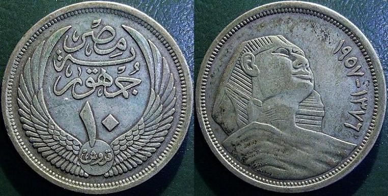 Dritto: Il numero arabo “10” del nominale è sovrapposto a un piccolo cerchietto basso, contenente la scritta “Piastre”. Un paio di eleganti ali circonda l’iscrizione “Repubblica d’Egitto”, posta in alto su due righe. Bordo dentellato.