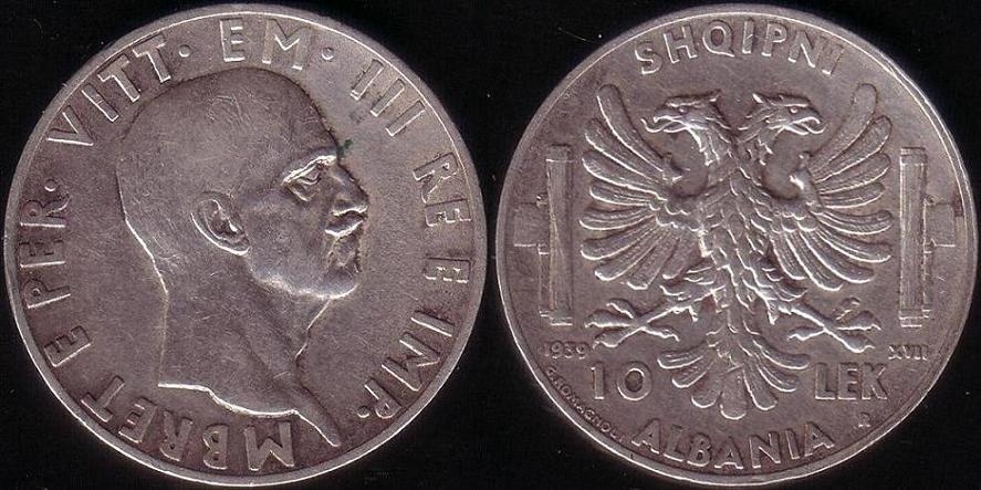 Rovescio: Aquila bicipite, stemma dell’Albania, posta tra fasci. In alto “SHQIPNI” e in basso la sua traduzione italiana “ALBANIA”. Ai lati della coda dell’aquila, il valore “10 LEK”; a sinistra la data “1939” e a destra l’indicazione “XVII” riferita all’era fascista. Sotto la parola “LEK”, la “R” della zecca di Roma e in basso, lungo il bordo sinistro, la firma dell’incisore “G. ROMAGNOLI”. Bordo liscio.