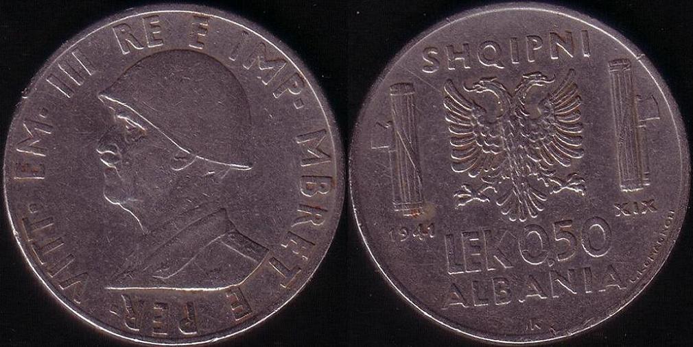 Rovescio: Aquila bicipite, stemma di Stato albanese, fra due fasci littori. Sotto l'aquila, il nominale "0,50 LEK", a sinistra la data e a destra l'indicazione dell'anno fascista. In basso la scritta "ALBANIA" e in alto "SHQIPNI" (Albania in lingua albanese). Lungo il bordo liscio, in basso al centro, la "R" della zecca di Roma, e sulla destra il nome dell'autore "G. ROMAGNOLI".